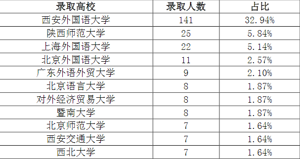 国内升学情况国内升学428人,分别进入104所高校或研究所攻读硕士学位。其中57所"双一流"、"985"、"211"院校录取201人,占升学人数46.96%。录取人数较多的高校有:西安外国语大学、陕西师范大学、上海外国语大学、北京外国语大学等。