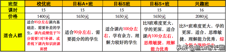 校优班适合校内85分左右,需要查缺补差的孩子。目标S+班则适合课内100分的孩子,最后剩下的目标S+班、兴趣班都是难度更大的班型,要求孩子学得更深,适合校内成绩十分优秀、思维敏捷的孩子。