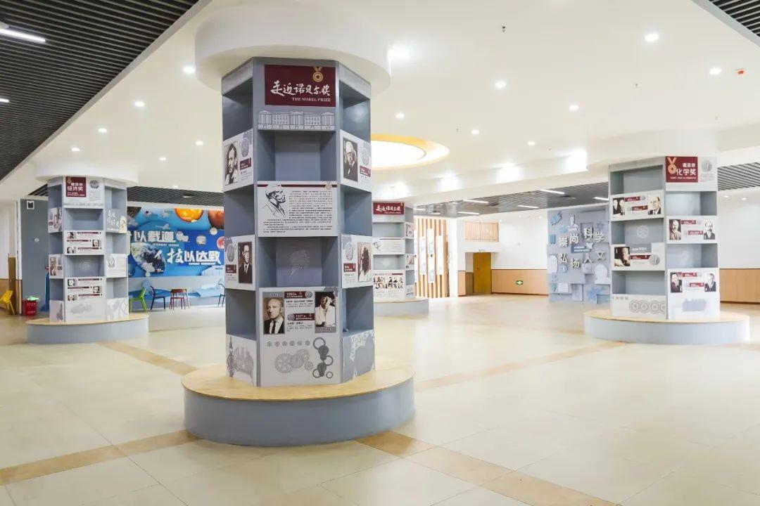 可以看到诺贝尔大厅从灯膜到柱子,一共展现了近40名诺贝尔得主的生平,而这中间还有一些空白的位置。询问之后才得知,这是东辰聚星为自己的学生预留的,以期在多年以后,东辰学子能将自己的名字增添上去。