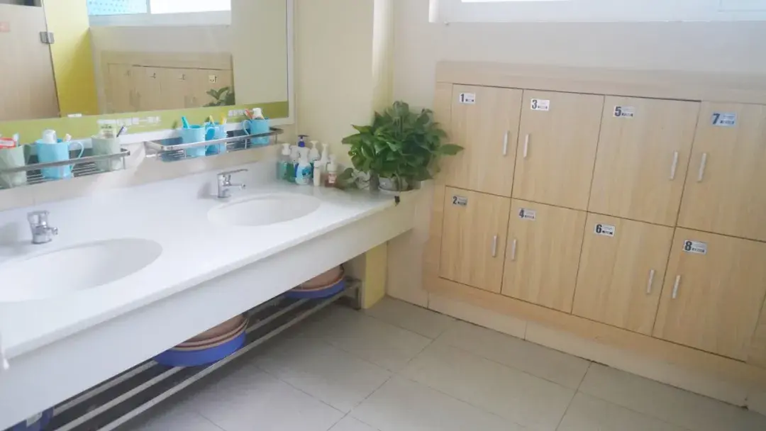 推开门,灯光舒适温暖,公寓内每间寝室配置八个床位、两个厕所、两个淋浴间、24小时热水供应系统,楼层直饮水、中央空调和新风系统,公寓广播每天早晚播放轻音乐,晚上播放睡前故事,并在学生生日当天送上生日祝福。值得一提的是,就连洗手台也根据不同年龄层的使用者特别定制了适宜的高度。