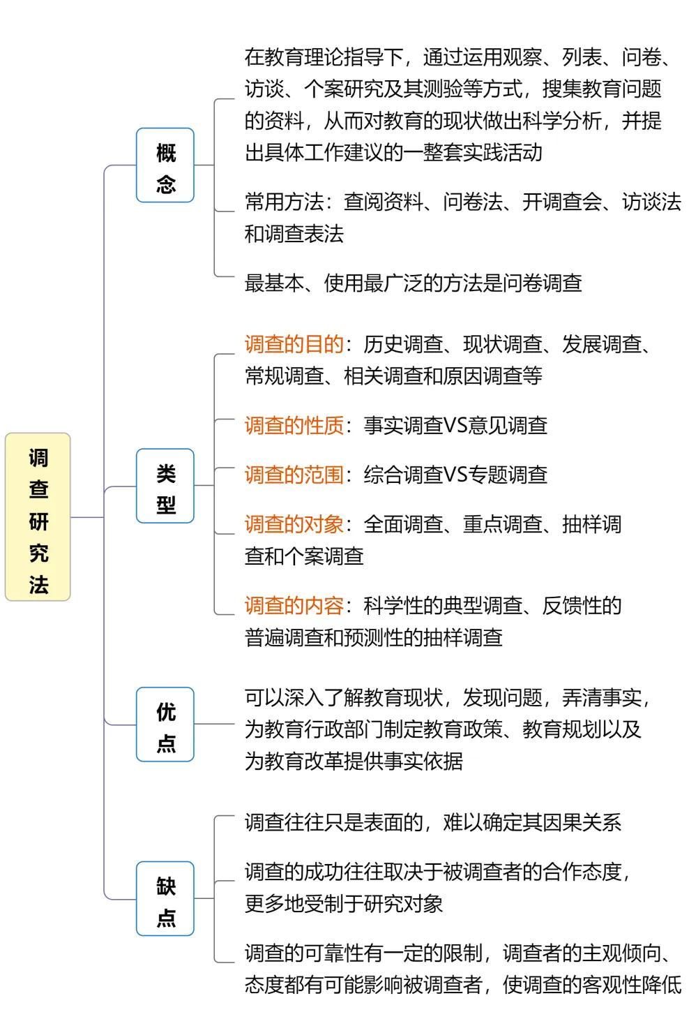 调查研究法是在教育理论指导下,通过运用观察、列表、问卷、访谈、个案研究及测验等方式,搜集教育问题的资料,从而对教育的现状做出科学分析,并提出具体工作建议的一整套实践活动。