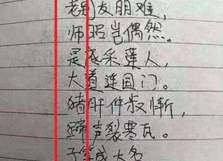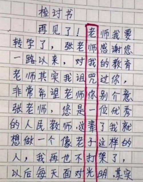 结果被老师抓包了,于是,小学生写下了一篇检讨书,表示,一路以来,感谢老师,并且夸赞老师很优秀,甚至向老师发誓,再也不打架了,表面看似唯唯诺诺,但其实别有洞天,其中一个竖行字连起来,就是“老师我咒你一辈子打光棍”,小学生真是太气人了。