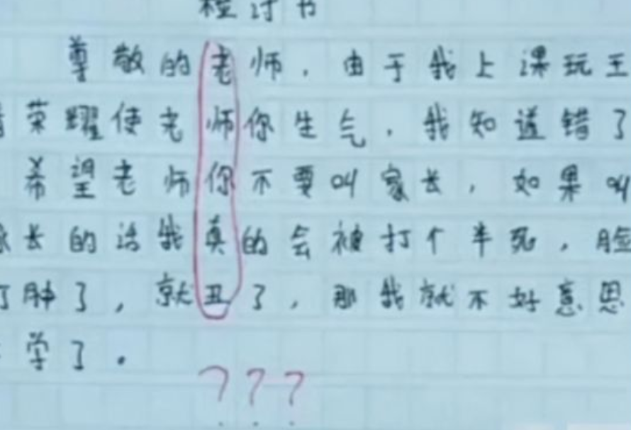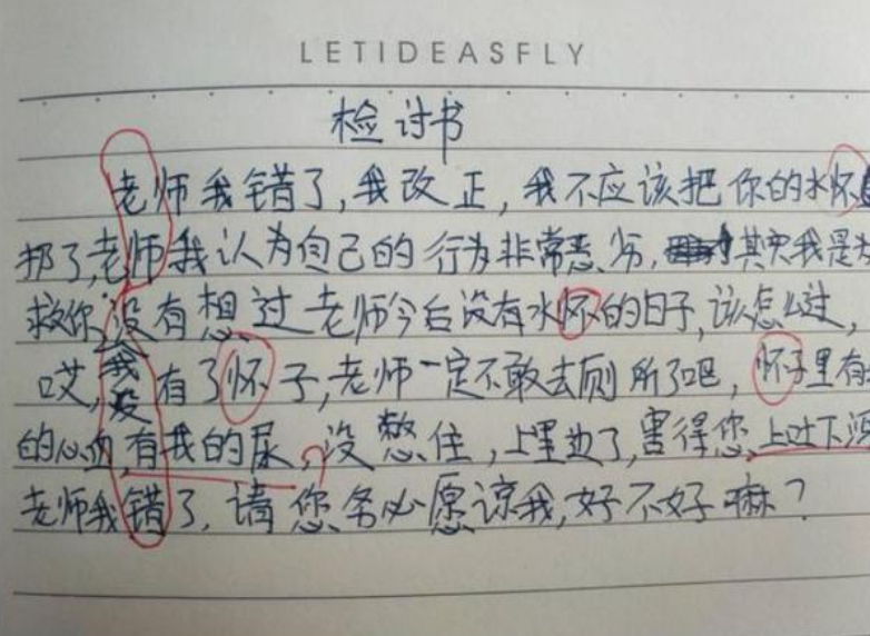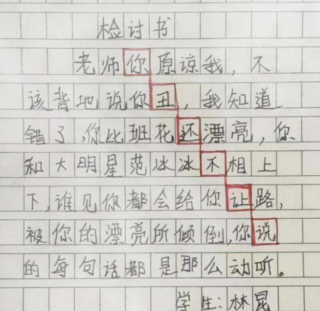 如果老师长得不好看,小学生私底下也会进行讨论,这不,小学生讨论的时候,被抓包了,于是,小学生写下了一篇检讨书,通篇都在承认自己的错误,夸赞老师的漂亮。