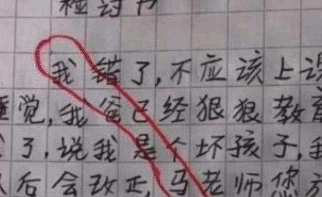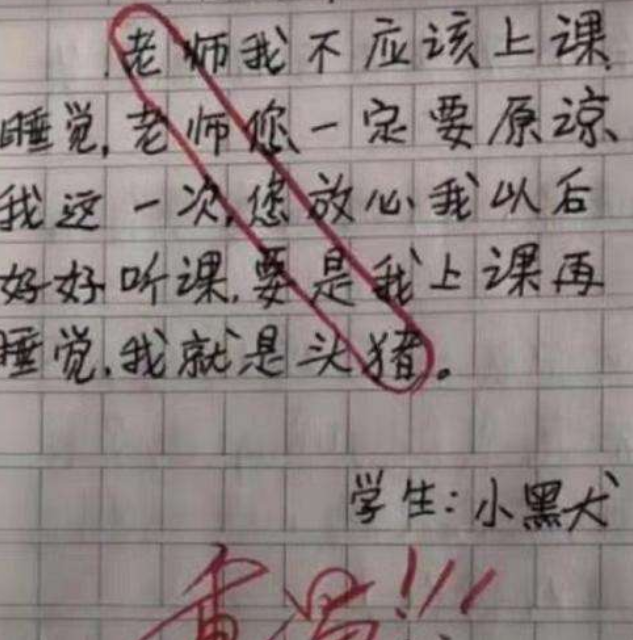 上课时,经常睡觉的小学生有很多,这不一位小学生上课睡觉被逮到了,于是,老师让小学生写检讨书,小学生马上对老师道歉,说再睡觉就是猪,但没有想到的是,仔细一读,才知道小学生是说老师您是猪,简直是挑战了老师的底线啊。