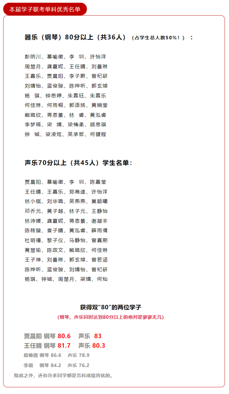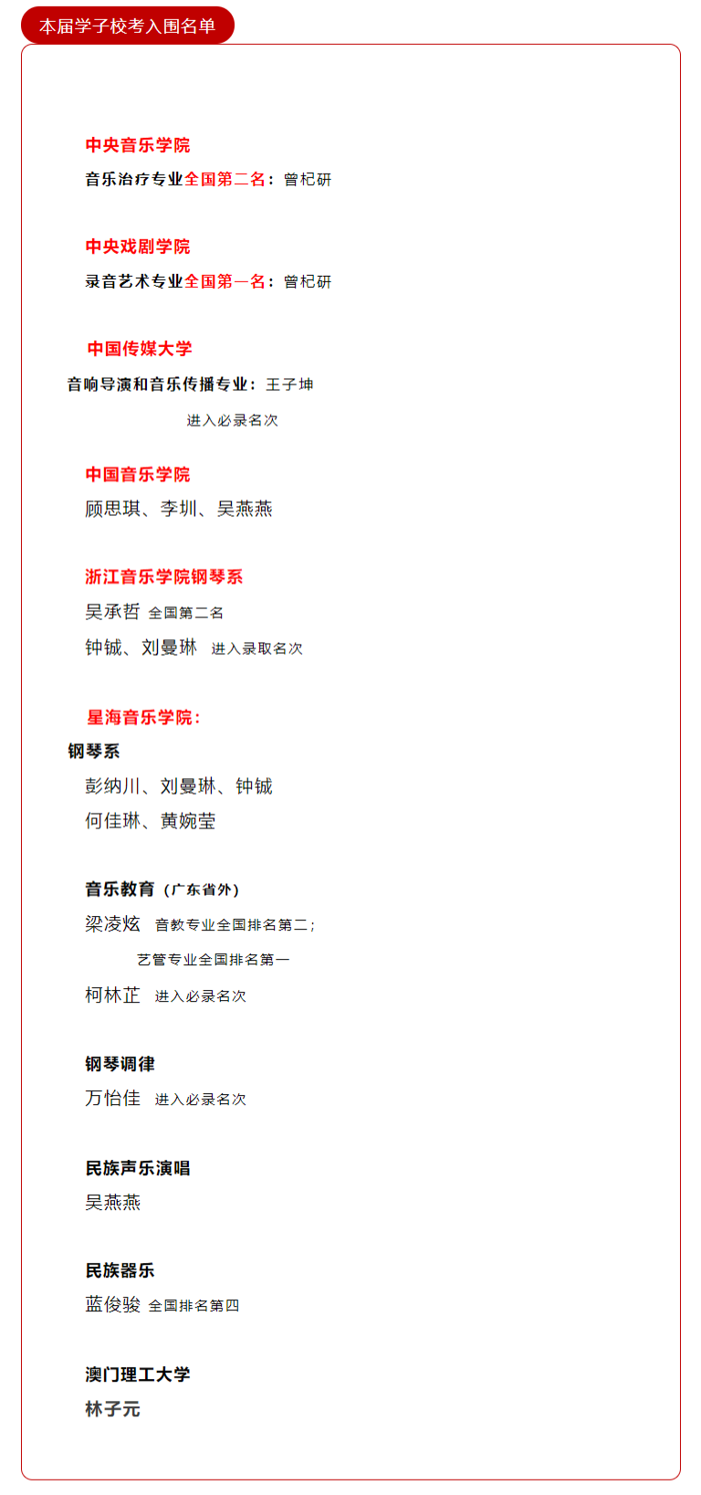 培养的学生,在高级别赛事中468人次荣获前三名。培养出多名艺考状元,共536人考上国家重点大学与世界顶尖音乐院校(重本升学率达93%)具体名单公布在本校区光荣榜上)。