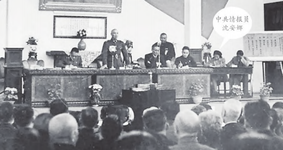 可以说,这张照片记录下了蒋介石很“尴尬”的一幕。这张照片,拍摄于1948年4月,蒋介石正在大礼堂“侃侃而谈”。而就在他左边不远处,坐着的那位女速记员,就是我党特工沈安娜。
