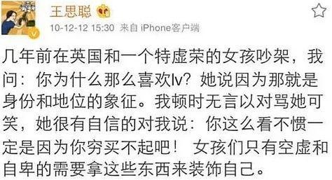 王思聪曾经发微博,指责初恋张倩爱慕虚荣,特别喜欢LV,觉得是身份和地位的象征,王思聪觉得只有空虚和自卑,才会买这些东西买装饰自己。