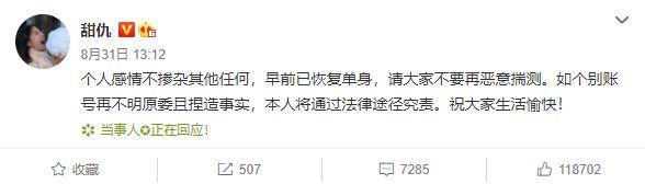 2020年5月7日,王思聪和甜仇外出就餐,王思聪还主动喂女友甜仇,不过爱情来得太快,就像龙卷风,仅3个月的时间,2020年8月31日,甜仇就宣布已经恢复单身。