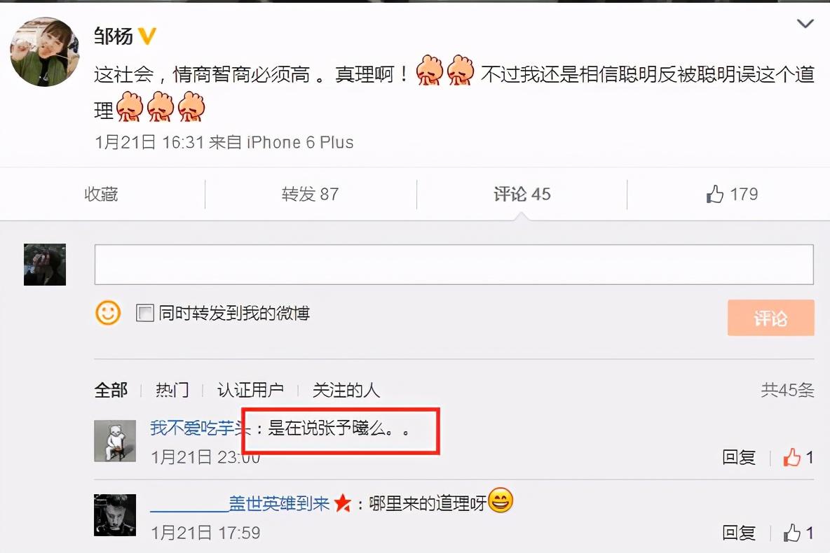 后来邹杨发了微博,疑是回怒张予曦:“我还是相信聪明反被聪明误这个道理”。