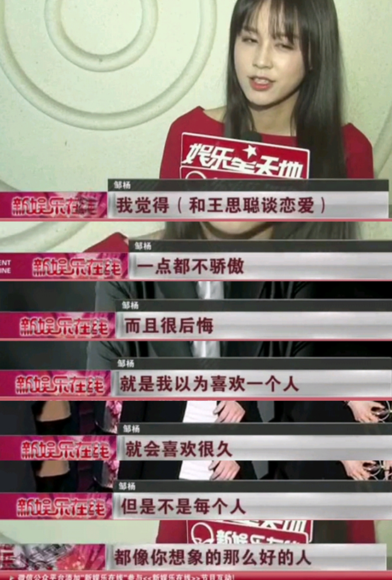 邹杨还表示和王思聪谈恋爱,一点都不觉得骄傲,相反很后悔,因为他没有自己想象中那么好。