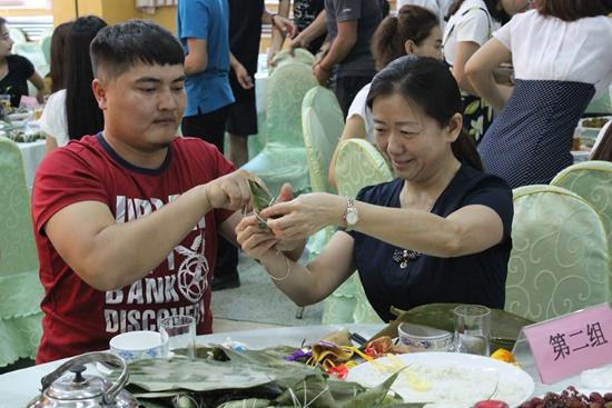 绿粽叶、白糯米、大红枣……看到飘香的备料,师生们迫不及待地加入比赛,一时间粽叶舞动,红绳穿梭,快乐的笑声传遍了整个餐厅。有的参赛组动作麻利熟练,转眼间就包出了一个个漂亮的粽子;也有的组绳子还没来得及捆,粽子叶就散了,糯米洒了一桌……各具特色的粽子——三角的、四角的、长方的……也有说不出形状的,在师生们的欢笑声中装了满满的一盘盘。活动期间,水利与土木工程学院还安排了知识问答、心有灵犀等游戏环节,让大家在欢声笑语中共享传统节日的乐趣。