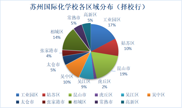 苏州市内的国际化学校主要分布于:工业园区、相城区、姑苏区和吴中区、吴江区,其次代管的市里面,昆山市内开办的国际学校也非常多,能占到总数的19%。
