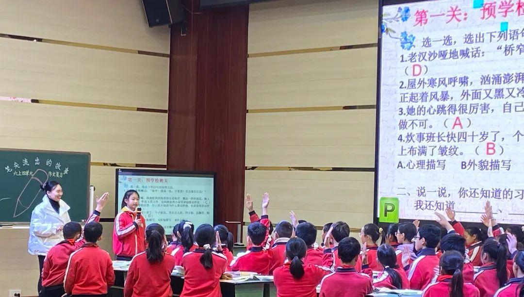 沙河实验小学校吴林幸老师展示的是六年级上册第四单元“笔尖流出的故事”作文复习课。吴老师的课灵动扎实,课堂教学设计巧妙,以“文章上报 激趣引入——预学检测 再现方法——运用方法 改创故事”三个简单清晰的教学环节组成,环环相扣,节奏流畅,轻松自然,课中学生个人独学、同伴互学、小组合学体现得淋漓尽致,教师循序善诱,层层推进,一气呵成。