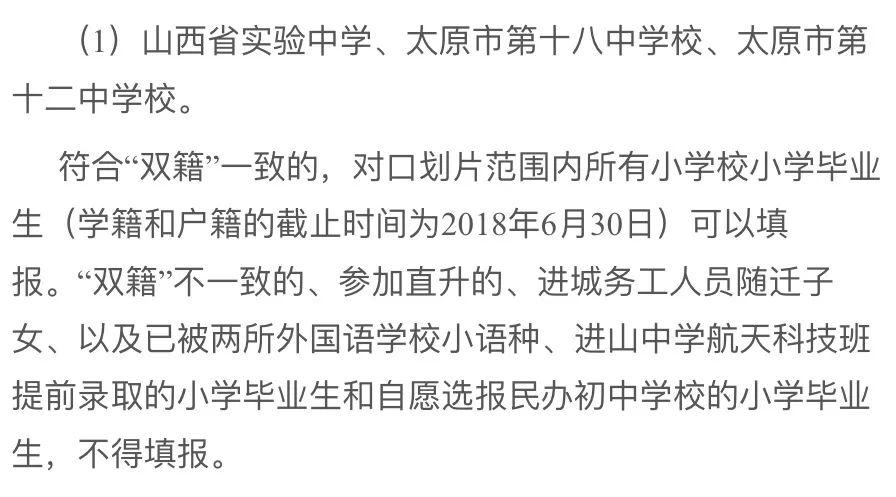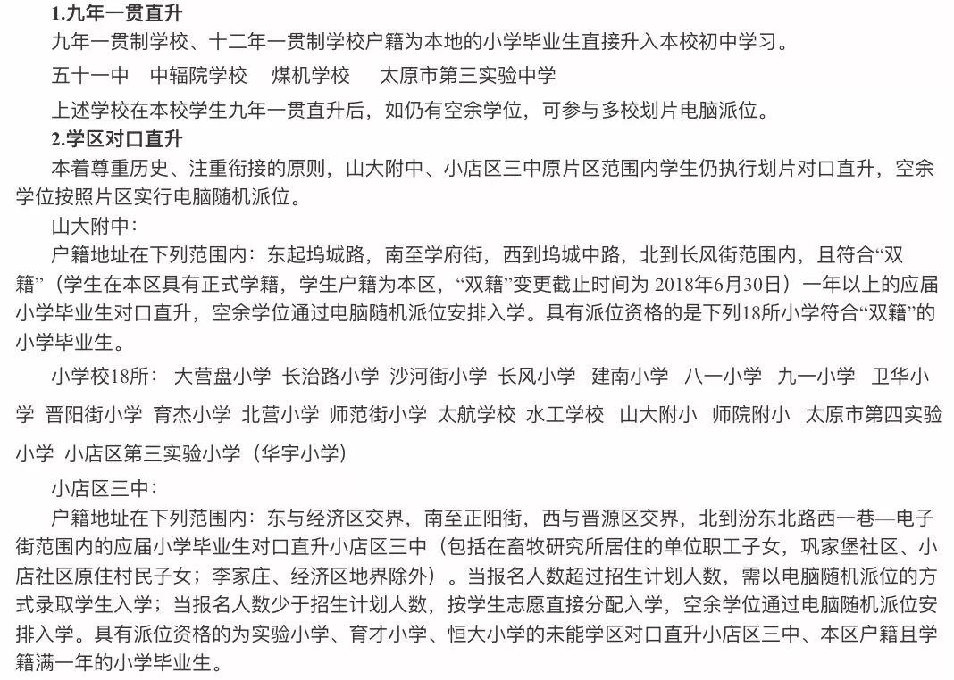 凡位于晋阳街以南,汾东北路西一巷--电子街--电子街以东直线延伸区域以北,机场快速路以西,西与晋源区交界范围内的小店区属学校(师院附小参加山大附中摇号除外、九年一贯制学校太原市第三实验中学除外)中有本校正式学籍、户籍为小店区,且学籍和户籍变更截止时间为2018年6月30日的应届小学毕业生,有资格参加太原五中龙城校区的电脑派位。