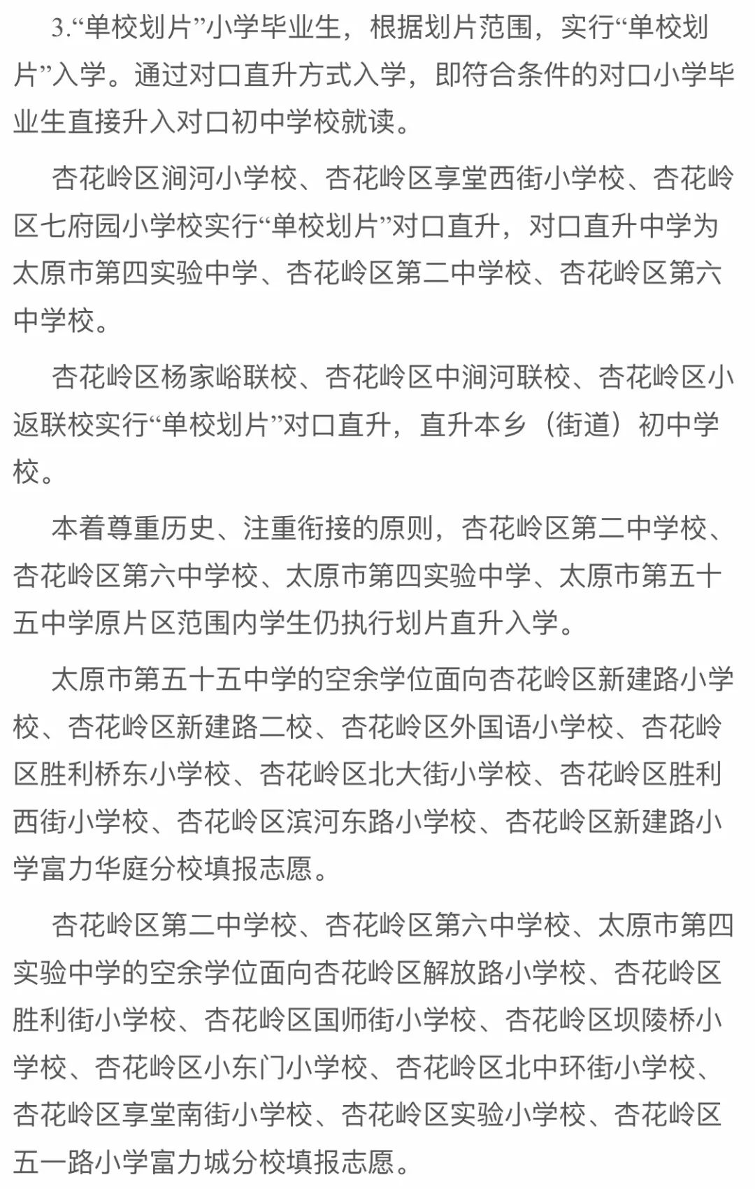 进城务工人员随迁子女,两县(阳曲、娄烦)已建档立卡贫困家庭子女等其他情况,按相关文件规定执行;派位完成后仍有空余学位的初中学校,可结合户籍、住址、学籍等,统筹接收小学毕业生(含进城务工人员随迁子女)就读。