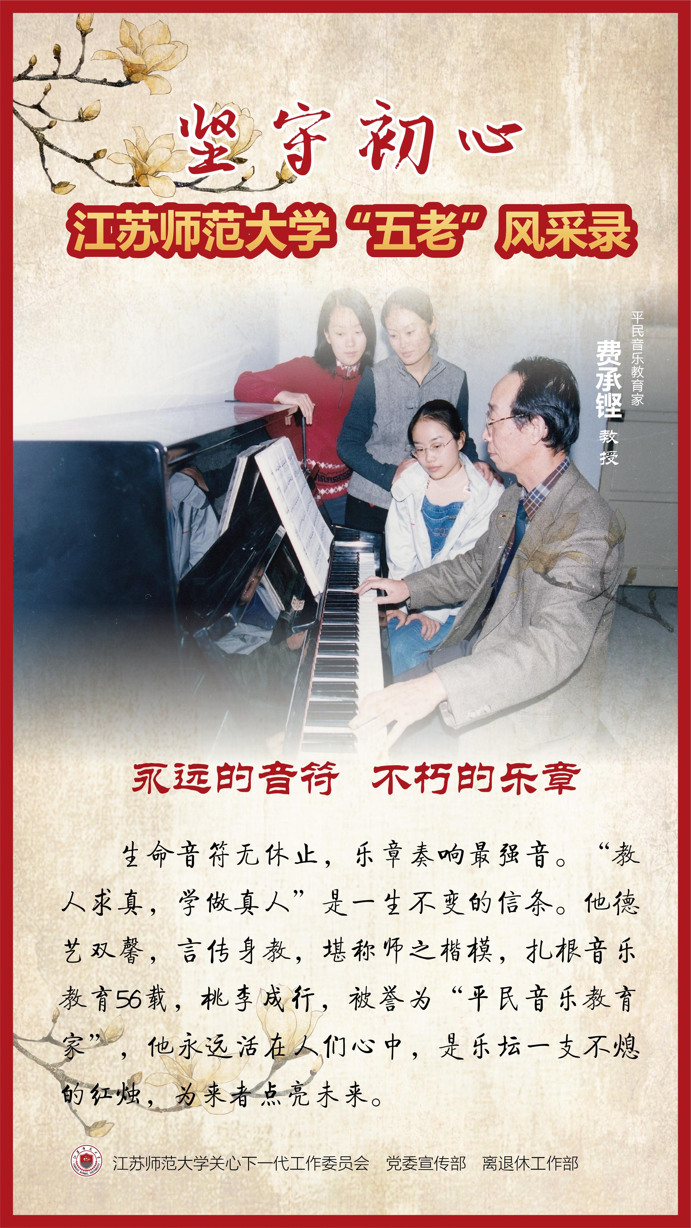 费承铿教授1937年出生于苏州名门望族,1956年南京师范学院(今南京师范大学)毕业后,扎根音乐教育事业56载,潜心研究,专于治学。他不仅教育教学成果丰硕,而且用他无私奉献的一生践行了“千教万教,教人求真;千学万学,学做真人”的职业信条,成为我校永不熄灭的“乐坛红烛”。