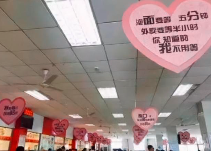 而这所大学食堂当中的标语,让学生们看起来就觉得特别的暖心,上边写着“泡面要等五分钟,外卖需要等半小时,你知道的,我不用等”。
