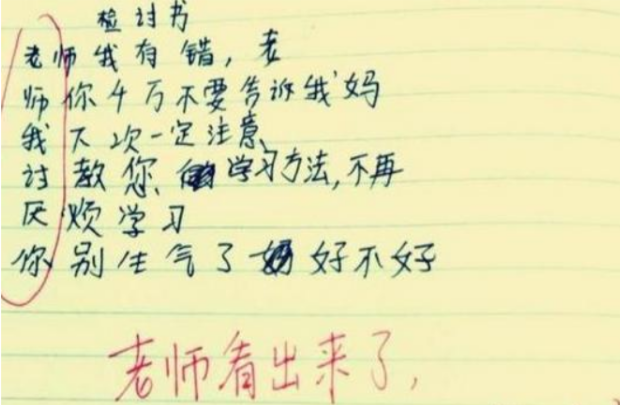 就在老师以为他真的在反省时,却发现这一长串检讨连起来,竟然正是讲老师坏话。一面写检讨,一面继续犯错,这样的同学也是没谁了。