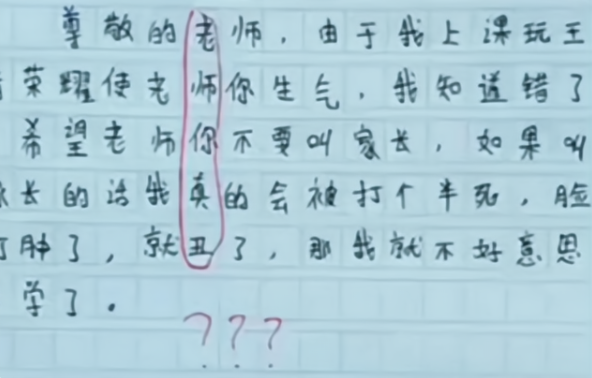 老师发现以后,让这位同学写检讨书,他坦言希望老师别告诉家长,一旦被父母知道可能自己的脸就要被打肿了。可老师却发现了端倪,原来连起一行赫然是“老师真丑”。