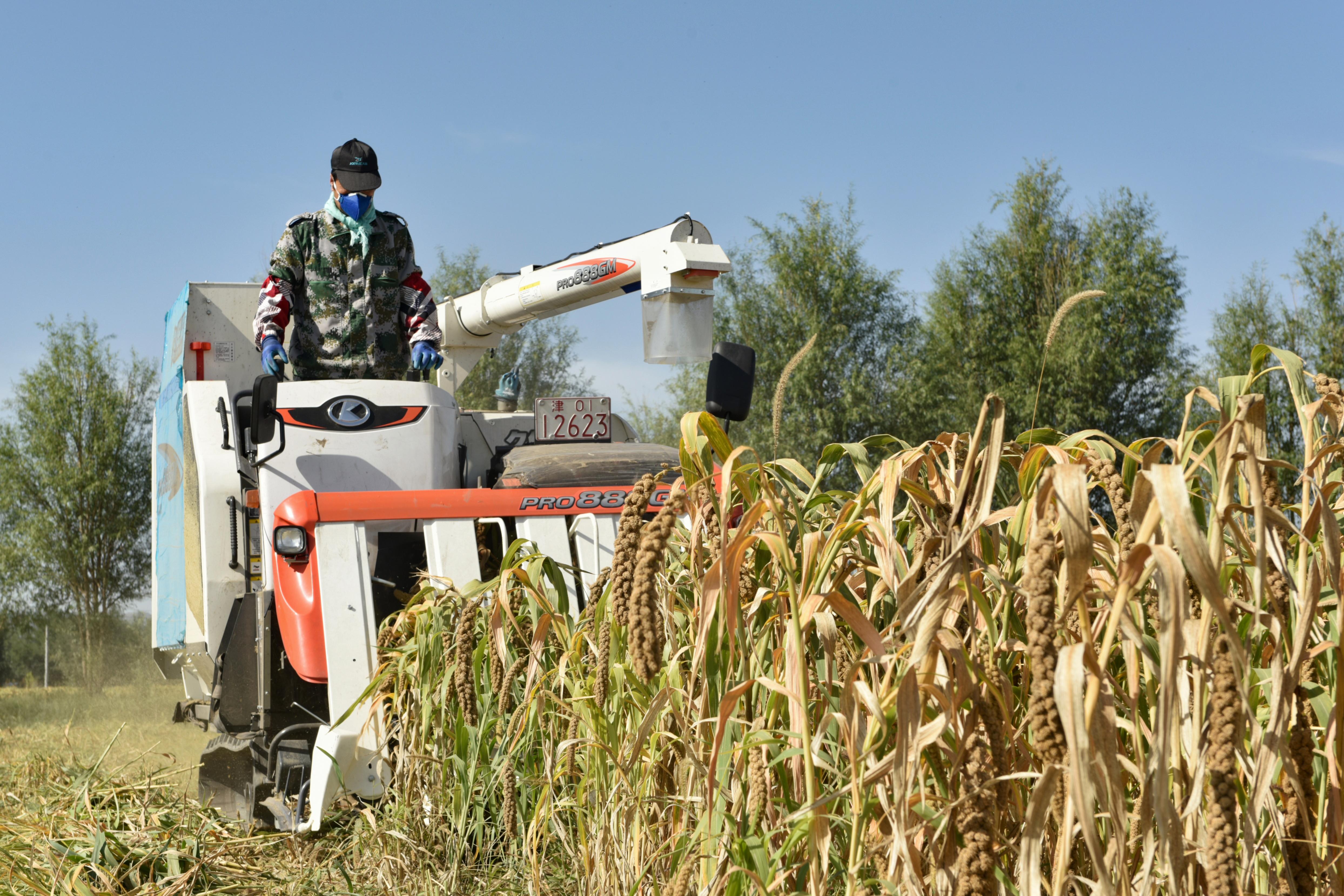 说明: 原州区彭堡镇稻谷喜获丰收,农民正在收割稻谷。