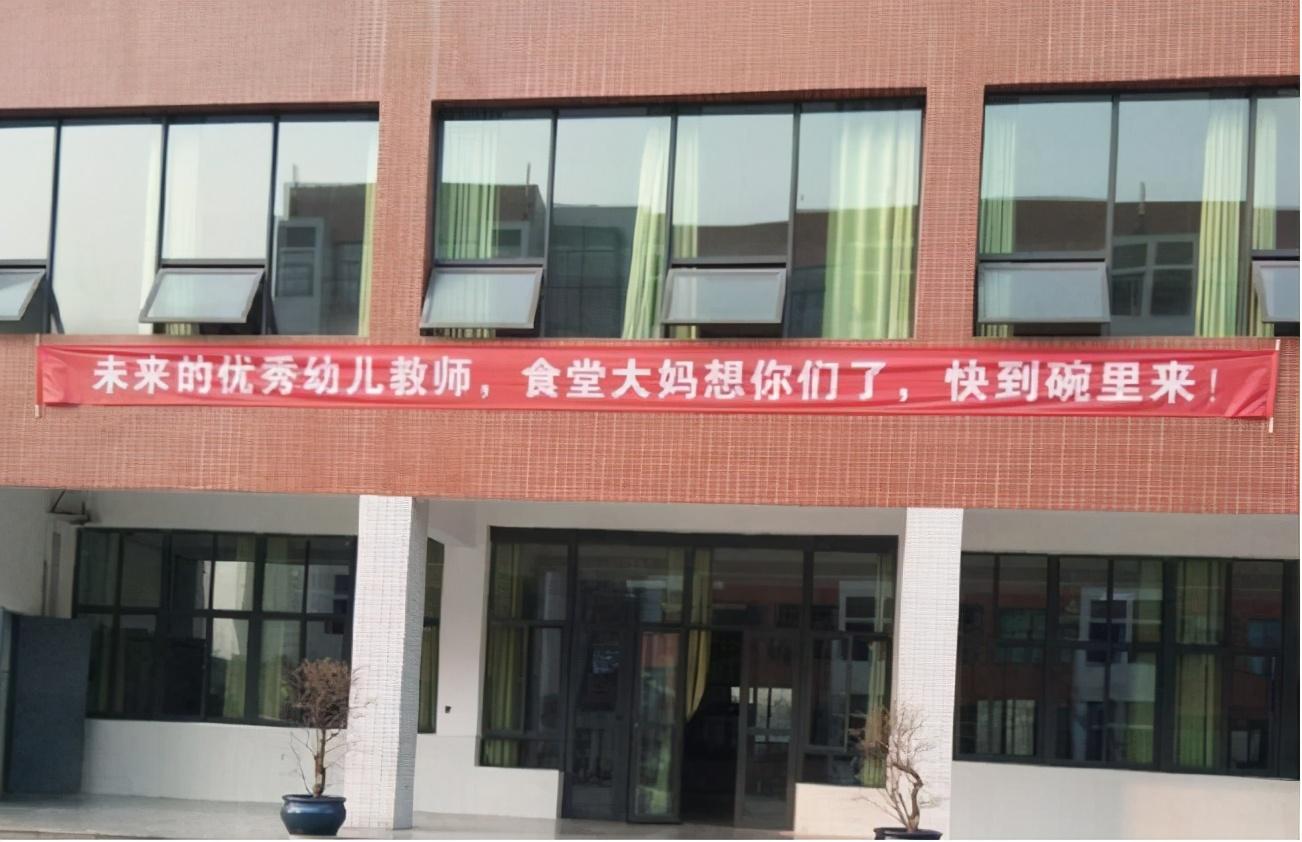 这一看就是幼师类学校的食堂,可能是最近学生们都没有到食堂吃饭,食堂大妈也坐不住了。直接表达了对学生们的思念之情。标语上赫然写着“未来的优秀幼儿教师,食堂大妈想你们了,快到碗里来”。