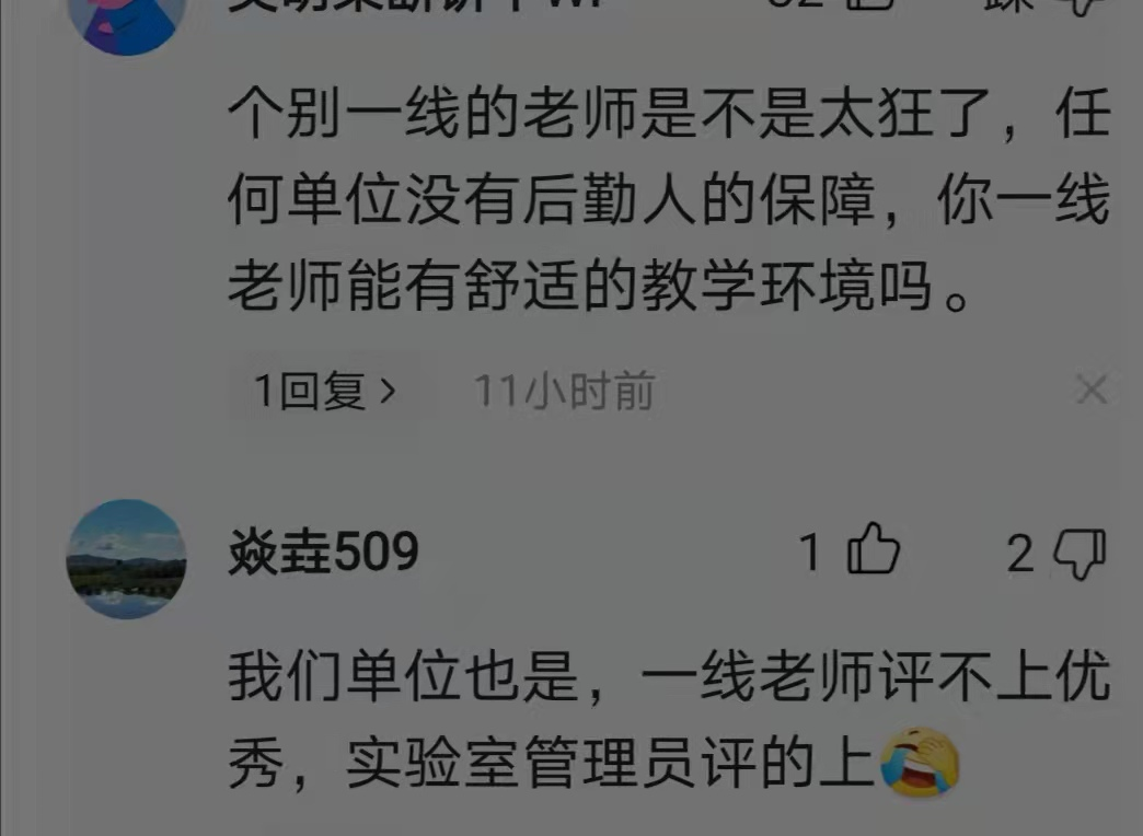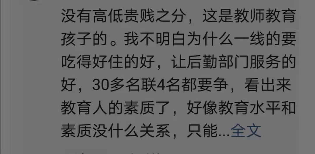 还有网友说:“个别一线老师是不是太狂了,任何单位没有后勤人员的保障,你一线老师能有舒适的教学环境吗?”