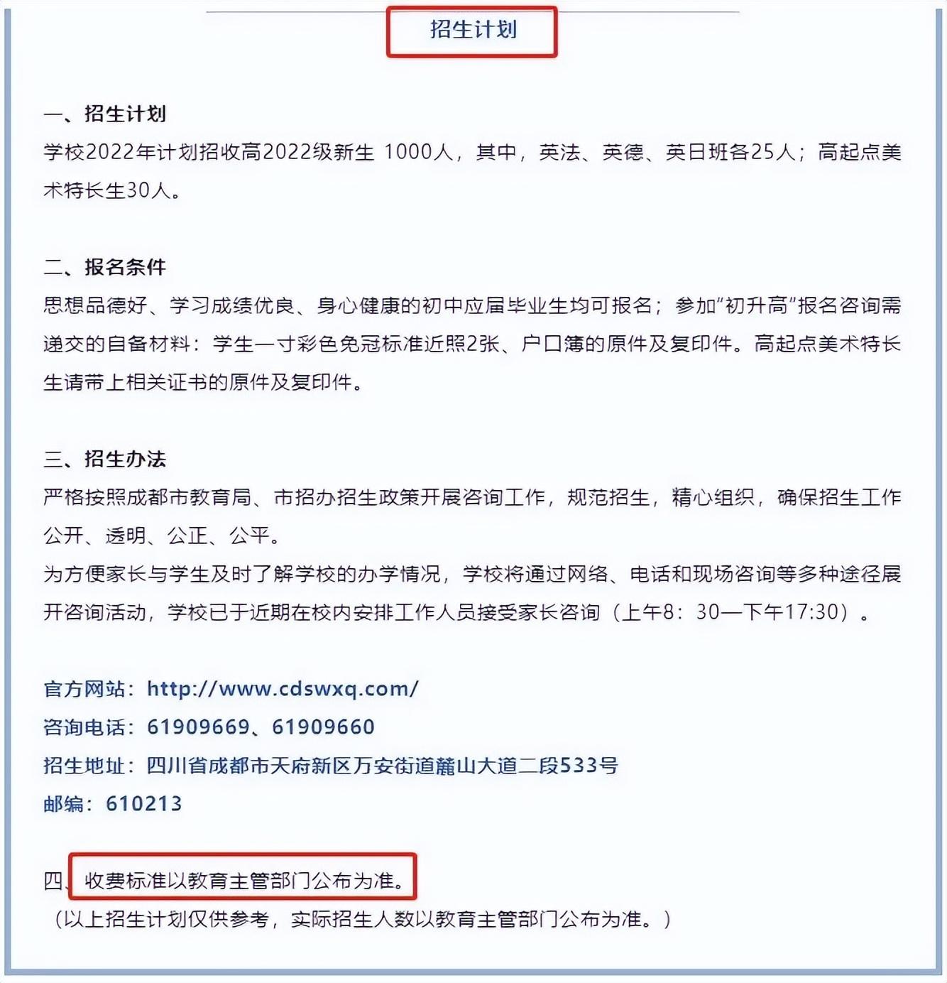 根据前期四川天府新区实外高级中学公布的招生计划显示,该校高2022级新生计划招收1000人(含计划直升750人)。而对于上述投诉中关键的收费标准,在该招生计划中并未明确显示。
