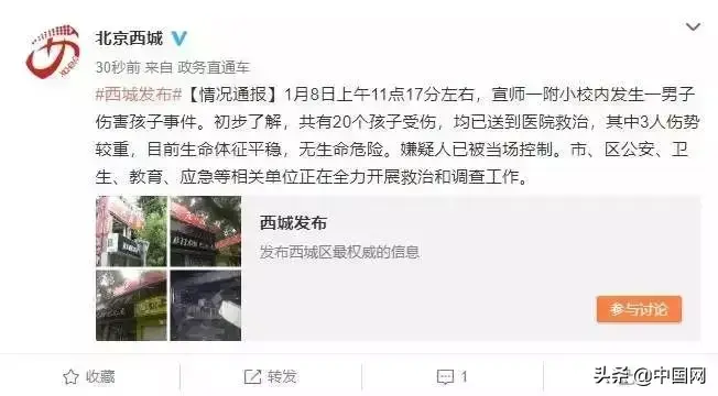昨天(8日)上午11点17分左右,北京市西城区宣武师范学校第一附属小学发生一起男子伤害学生事件。当地政府发布消息称,共有20个孩子受伤,均已送到医院救治,其中3人伤势较重,目前生命体征平稳,无生命危险。嫌疑人已被当场控制。