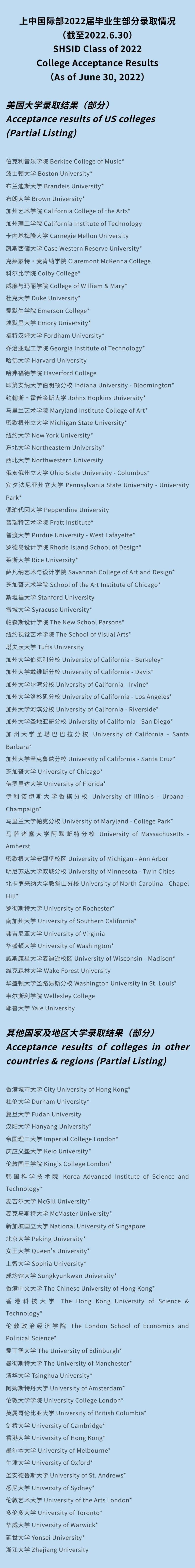 上海中学国际部在高中阶段开设有AP课程。学校官网显示,在学校2022届毕业生中,预计有约108位将前往美国深造,约109位将去往英国、加拿大、中国、韩国、日本等其他国家和地区深造。在前往美国深造的毕业生中,预计超过95%的学生被美国排名前50(按照《美国新闻与世界报道》2022年排名)的高校录取。学校2022届毕业生收获的录取通知包含哈佛、耶鲁、加州理工、斯坦福、牛津、剑桥等英美最顶级高校。