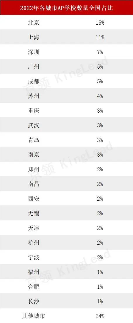 从城市分布来看,截止到2022年9月,就总体而言,除了北京、上海、深圳、广州、成都,全国AP学校在各个城市的分布较为均匀。大部分学校坐落在北京和上海,数量分别占比约15%和11%;深圳、广州和成都AP学校占比均在5%以上;其余城市AP学校的数量分布较为均匀。