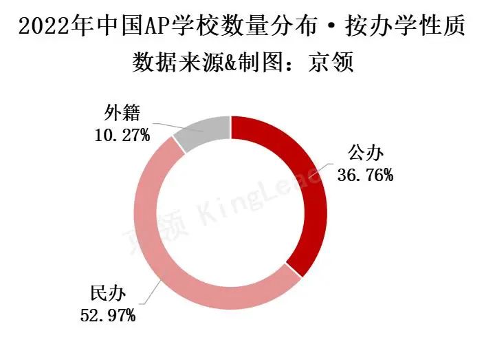 从办学性质来看,截止到2022年9月,在全国所有AP学校中,民办学校以超过50%的比例占据首位;公办学校数量其次,占比约36.76%;外籍学校占比约10.27%。