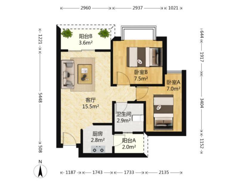 55-59平两房总价约 510万,户型图如下: