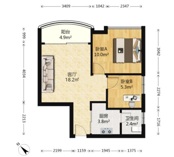 60平两房总价约490万,户型图如下:
