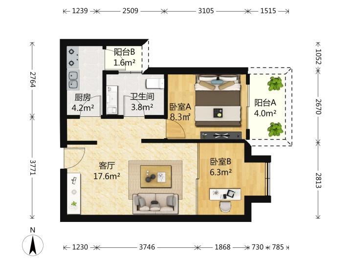 64平两房总价约620万,户型图如下: