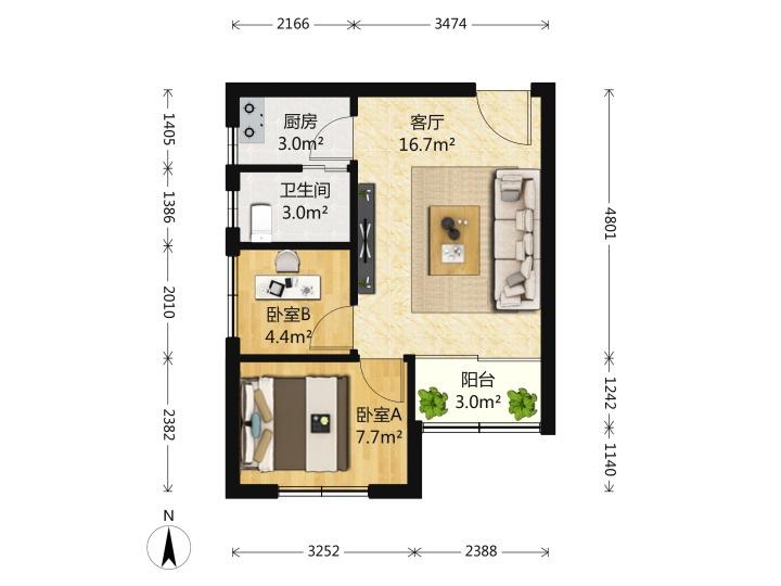 43平小两房总价约470万,户型如下: