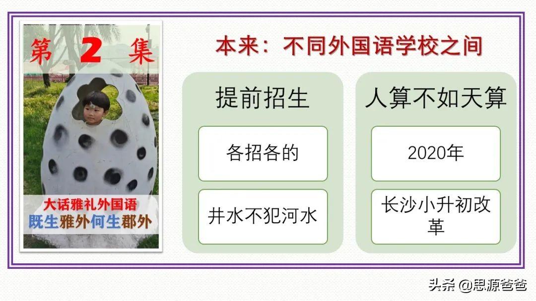 本来,不同外国语学校之间的提前招生,各招各的,大家井水不犯河水。然而,人算不如天算。2020年,长沙小升初改革一锤定音,混乱的外国语特色招生也被理顺,其中具体内容为:一个区只能有一所外国语学校,可以面向全区提前招生,而且名额受限,并且要先面试确定入围名单,再从入围名单中进行微机派位,入围和招生比为2:1。