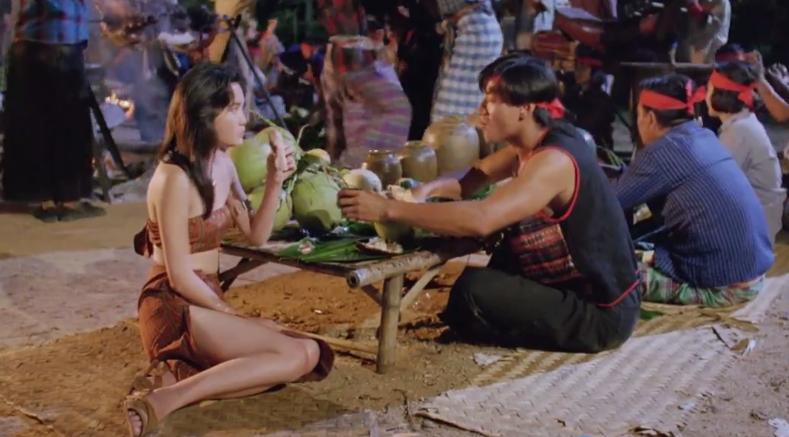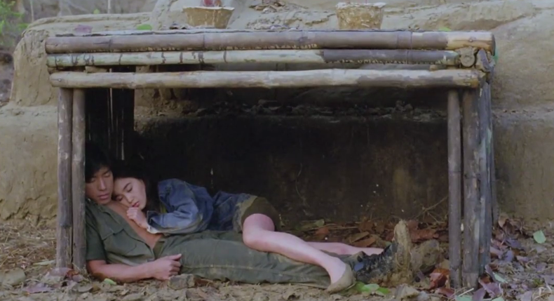 摆脱了追兵之后,夜色也开始降临。阿美、阿威躲在一个竹蓬内休息,经历了白天的同生共死,二人的关系也开始逐步拉近。
