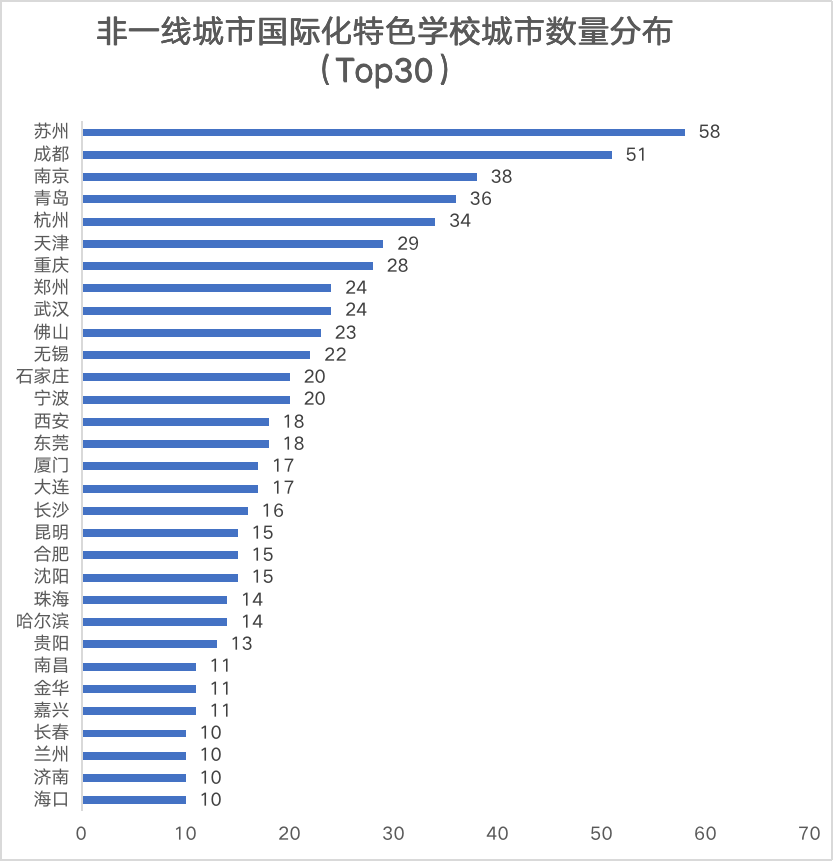 根据顶思研究部的数据,近十年来非一线城市国际化特色学校的增速平缓。国际教育在二、三线城市,甚至是县城有一定市场,但缺口并不大。省会城市因人口聚集、经济发达,该类型学校数量较多,小城市则默默无闻。