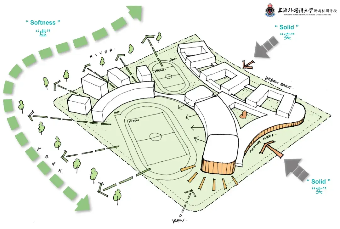 西、北两个方向作为自然景观引入面——将运动场地和学生公寓安置于此处,使整个校园既封闭又开放,既安静又动感,从而达成规划布局的虚与实、刚与柔的平衡。