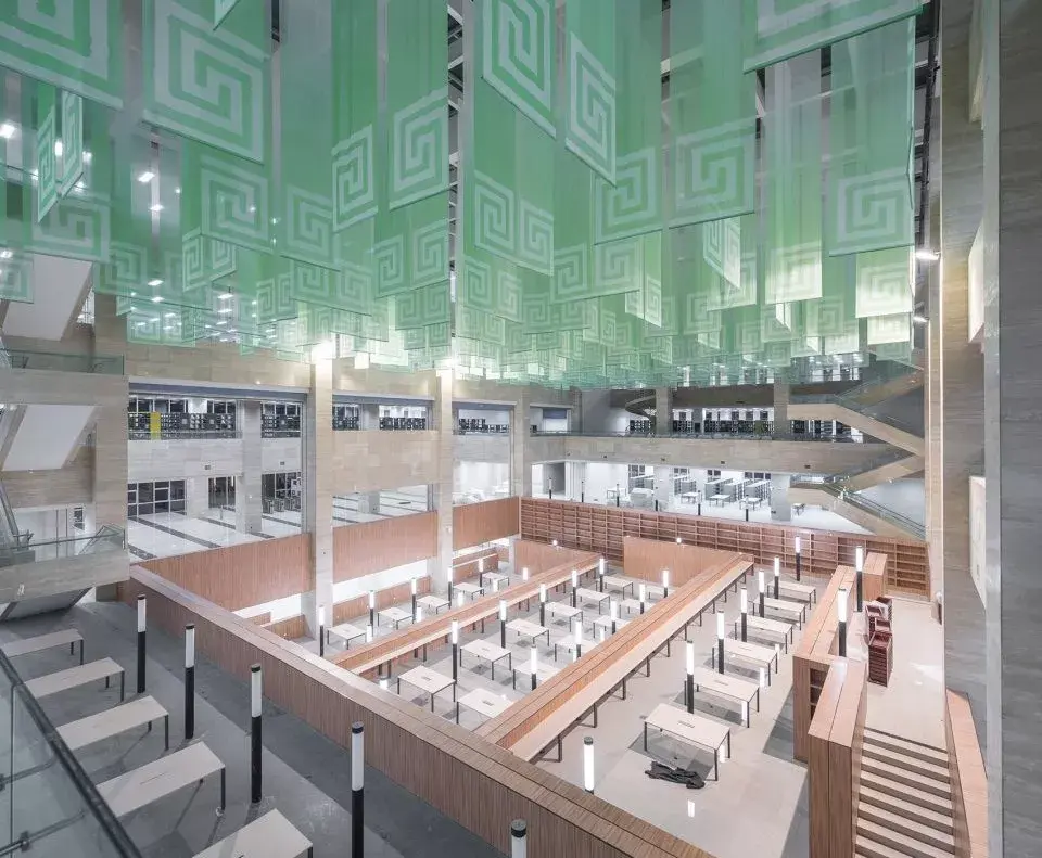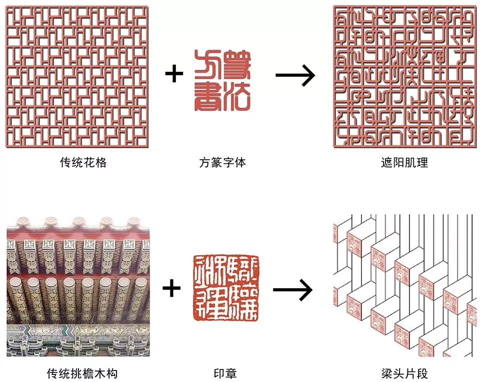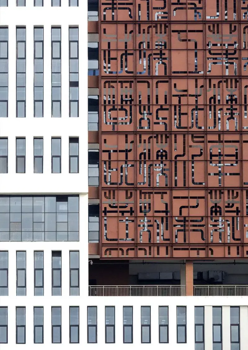 图书馆正门采用钢结构框架,通过对传统斗拱和支架的拆解和重组,诠释了传统的木结构。东西立面用木色金属板覆盖,刻有从校园历史文化中抽象出来的印章。对楚文化进行抽象和演绎,在新建筑中延续和传承历史背景。