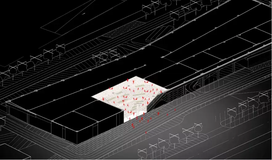 主入口,是学生每天必经的场所,通过阶梯将学生便捷地引向教学楼层,并且为学生创造了面向开阔麦田的休憩、社交场所。除了上下的交通,这里也会成为学生们课后休憩、畅谈、举办非正式的演讲,乃至毕业合照留念的场所。