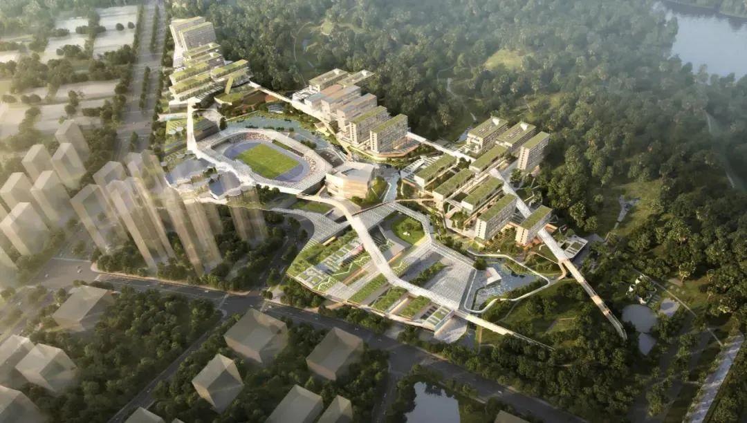 由于项目位于城市与生态区的交界地带,中标方案的新建建筑与自然交织起来,形成一个积极而健康的界面。其中,校园试图最小化建筑及交通占地,使得新的建成肌理与自然更好地交织融合,因而采用紧凑组团式布局。国际交流中心、图书馆等公共组团紧邻街道,方便与社区共享,塑造积极的城市界面。三院一体的校园组团位于东侧自然边界,底层架空,最大程度保护生态本底。