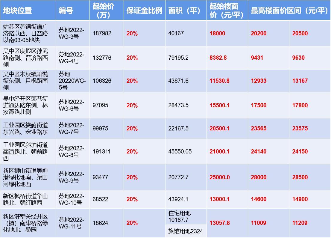 姑苏区1块,吴中区3块,高新区4块,工业园区3块,相城2块,吴江2块,主要分布于园区娄葑、斜塘,新区狮山、枫桥、浒关,吴中尹山湖、木渎、太湖度假区,相城高铁新城、渭塘,吴江太湖新城盛泽等板块。