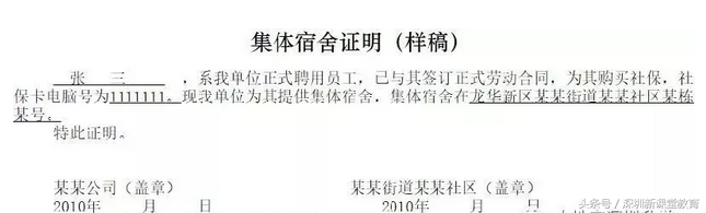 (4)加盖单位公章和辖区居委会公章的集体宿舍证明,集体宿舍证明样稿如图。
