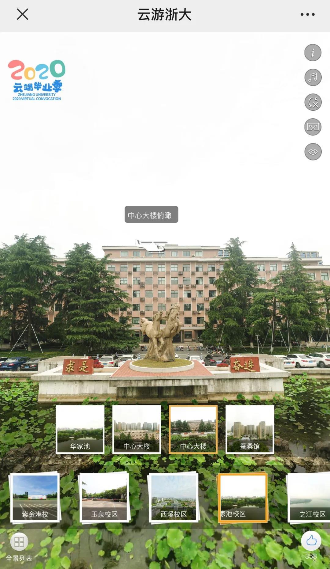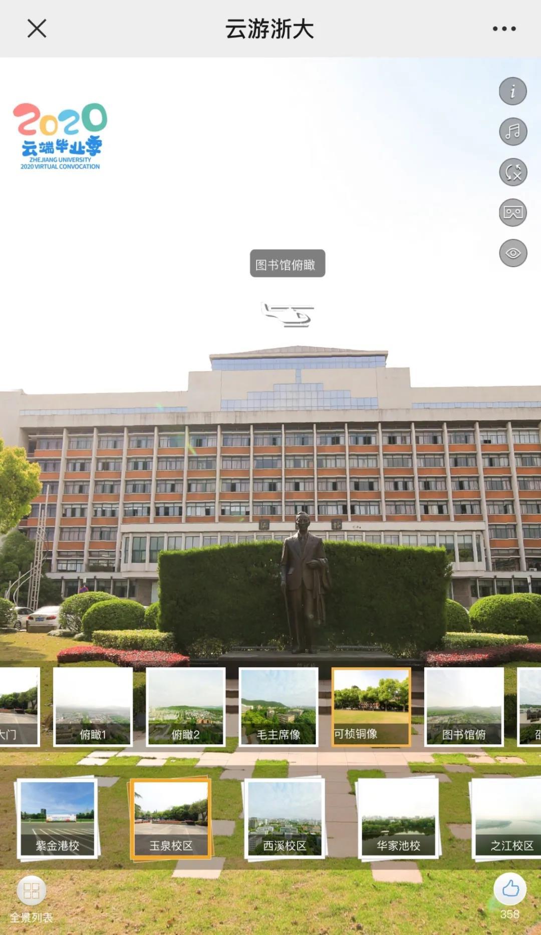 在线上邀约三五好友来一场特殊的毕业旅行吧!“打卡”浙大的七大校区,在360度全景中回望你一路的成长,回忆在浙大的点点滴滴,在熟悉的教学楼前、多次穿梭的马路边……留下你的足迹。