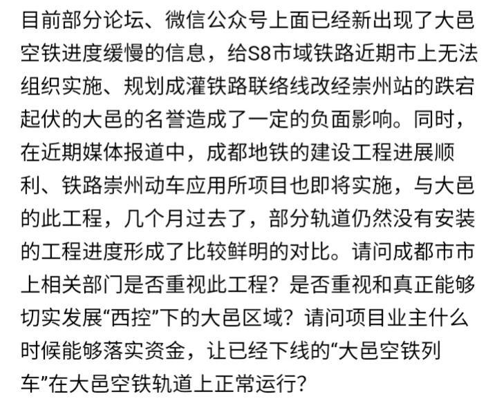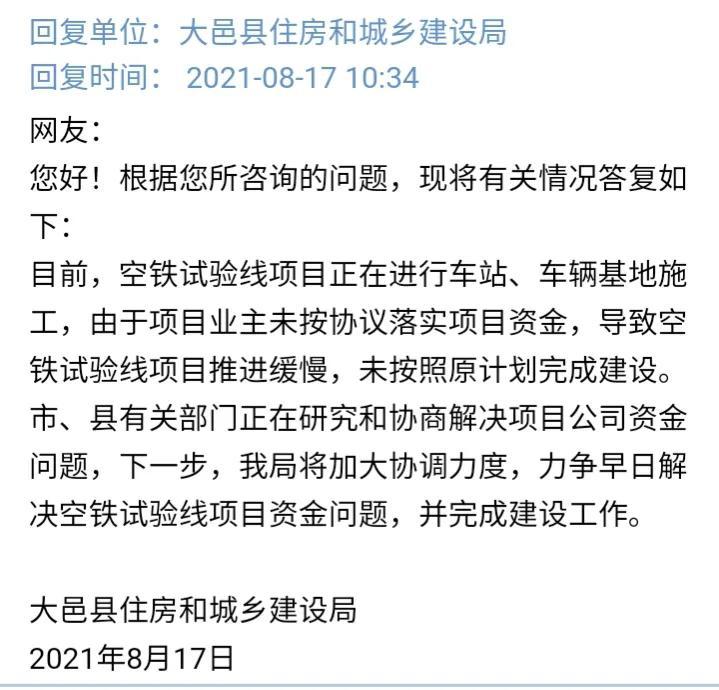 目前,空铁试验线项目正在进行车站、车辆基地施工,由于项目业主未按协议落实项目资金,导致空铁试验线项目推进缓慢,未按照原计划完成建设。市、县有关部分正在研究和协商解决项目公司资金问题,下一步,将加大协调力度,力争早日解决空铁试验线项目资金问题,并完成建设工作。