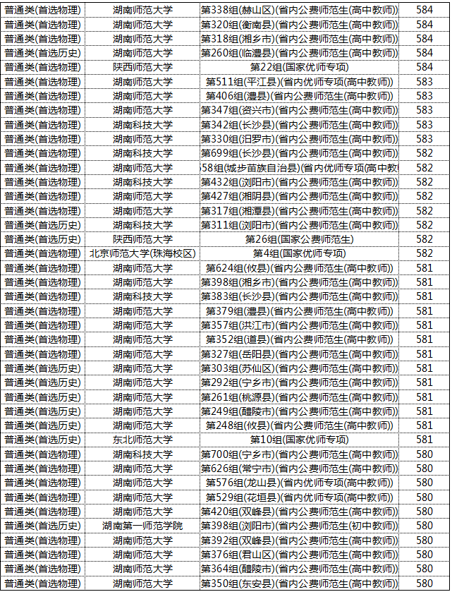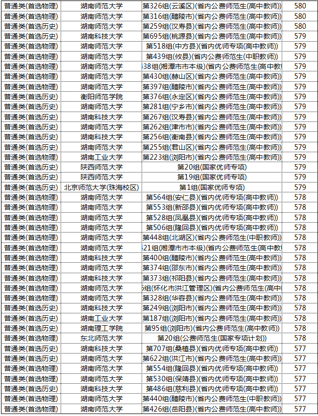 看到这里,大家也许会奇怪,除了有几所985高校在首选历史方面投入一些名额之外,为何整个湖南省的提前批中,570分以上的大部分都是公费师范生呢?其实,要回答这个问题也比较简单高分段看上去清一色的是公费师范生。