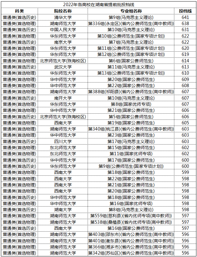 从公布的提档线来看,湖南师范大学在湖南省提前批中,首选物理的最高投档线为638分,对应的专业组为永定区(省内公费师范生高中教师),其分数比首选物理的华东师范大学、北京师范大学(珠海校区)以及华中师范大学的最高分数还高。