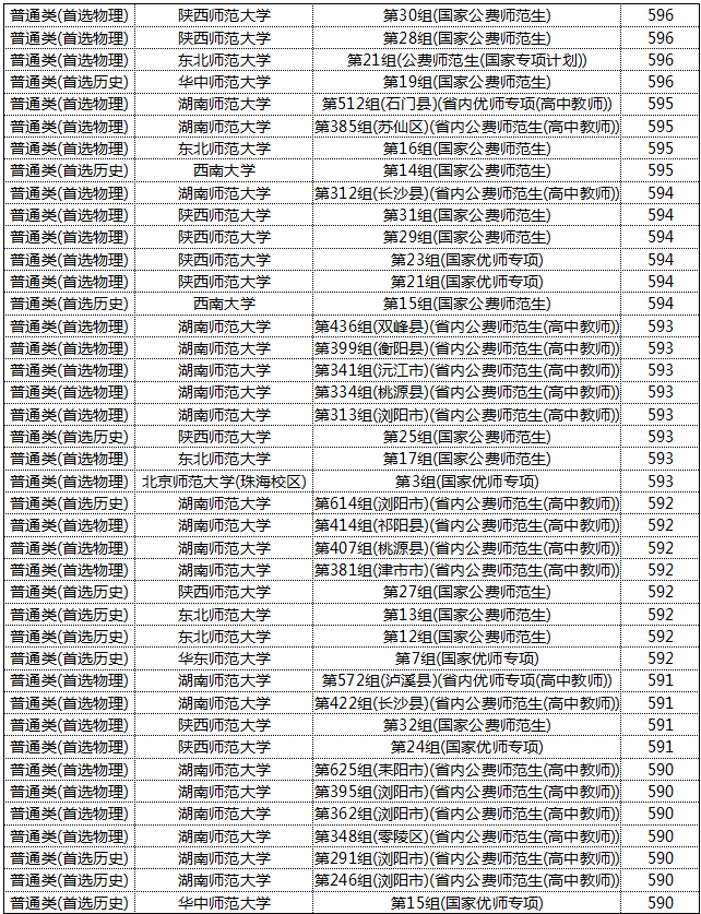 在首选物理方面的提前批,投档线靠前的基本上都以公费师范生为主,包含了北京师范大学(珠海校区)、华东师范大学、华中师范大学、西南大学、陕西师范大学以及东北师范大学,而这些师范类高校的投档线都比较高,由此可见公费师范生受湖南考生的欢迎程度。