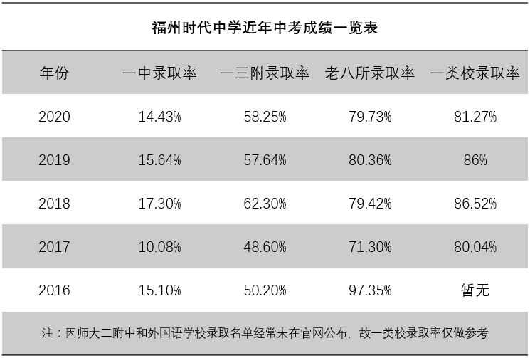 时代在2014年之前连续17年夺下福州市中考成绩第一名,近些年虽然被华伦反超了,但是老八所录取率仍然稳定在70%以上,紧随华伦之后。今年,时代中学关淇同学一举夺下福州市区投档分第一名。